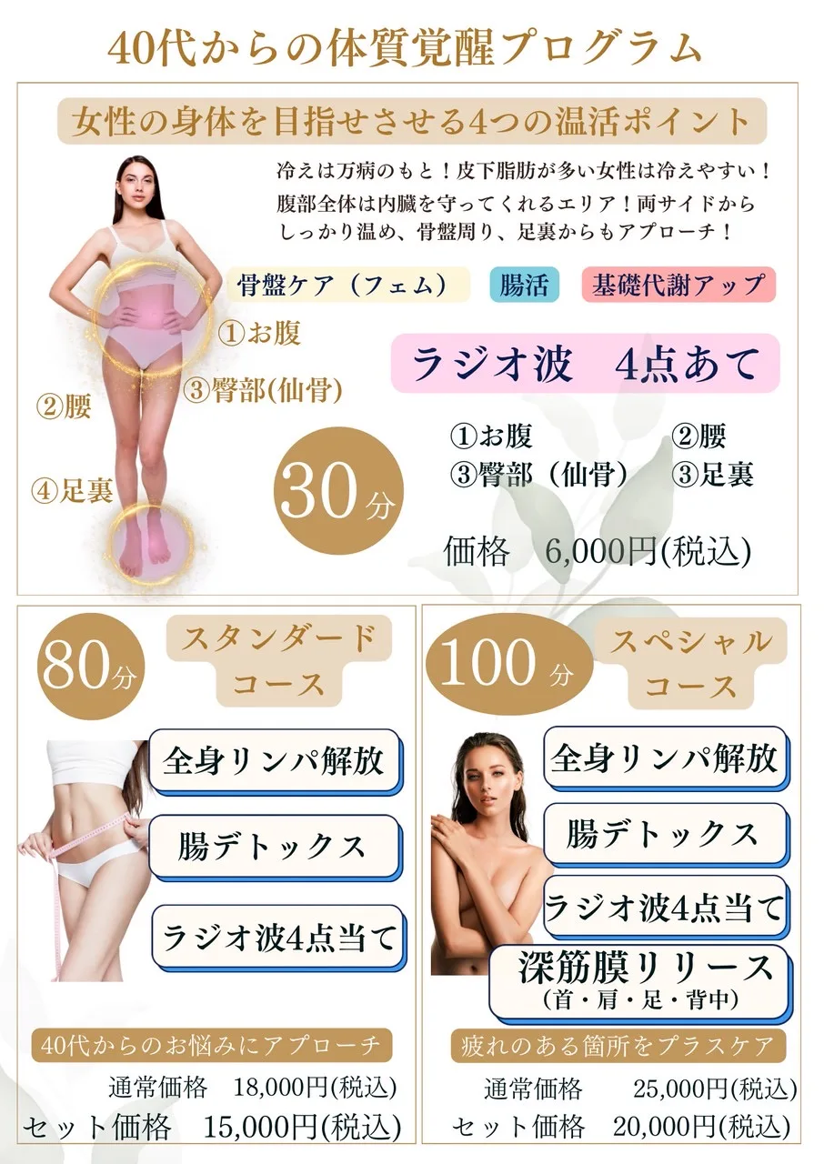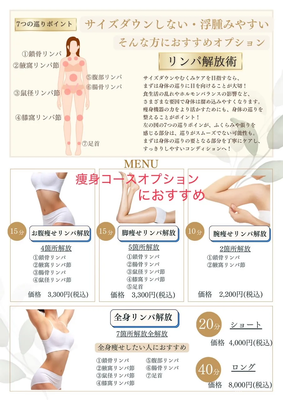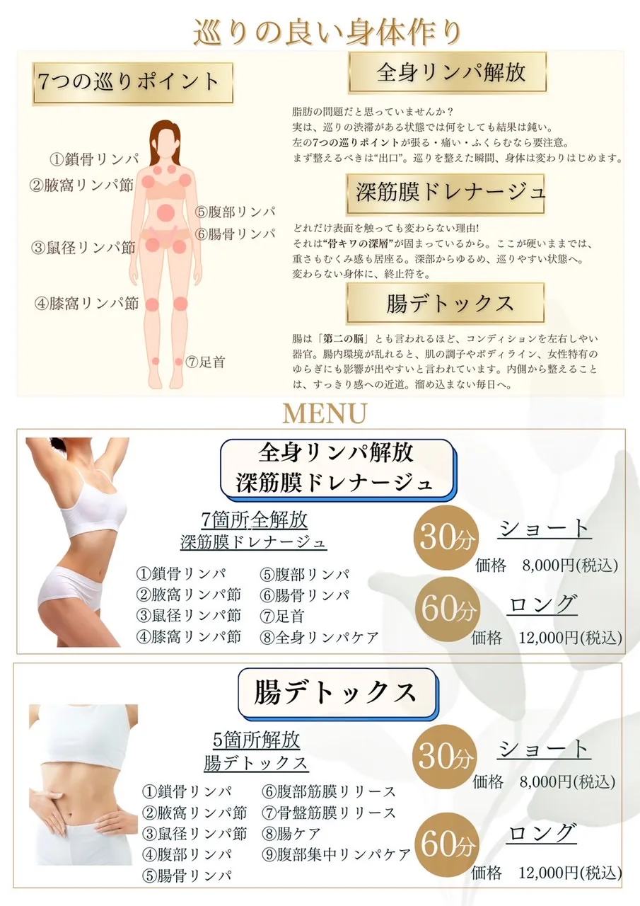 - フェイシャルメニューに:全身リンパ解放深筋膜ドレナージュコース